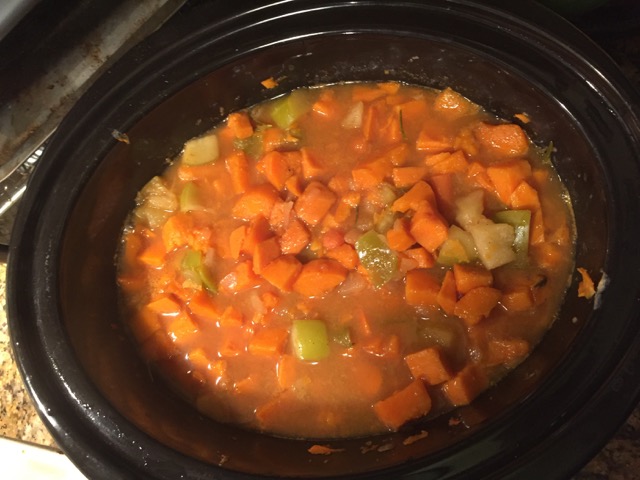 You want the solids to raise above the liquid by at least 1-1.5 inch. Stir together and let cook on high 4-5 hours, then low for any remaining time. Stir occasionally and taste for seasoning. Once the carrots and easy to pierce with a knife you are pretty much done. Use an emersion hand tool to puree the mixture (or get out you soup attachment for that fancy blender you have sitting on your shelf and blend in smaller batches). It should be on the thick side – somewhat like an orange porridge. Turn off the crockpot by now if you haven’t!