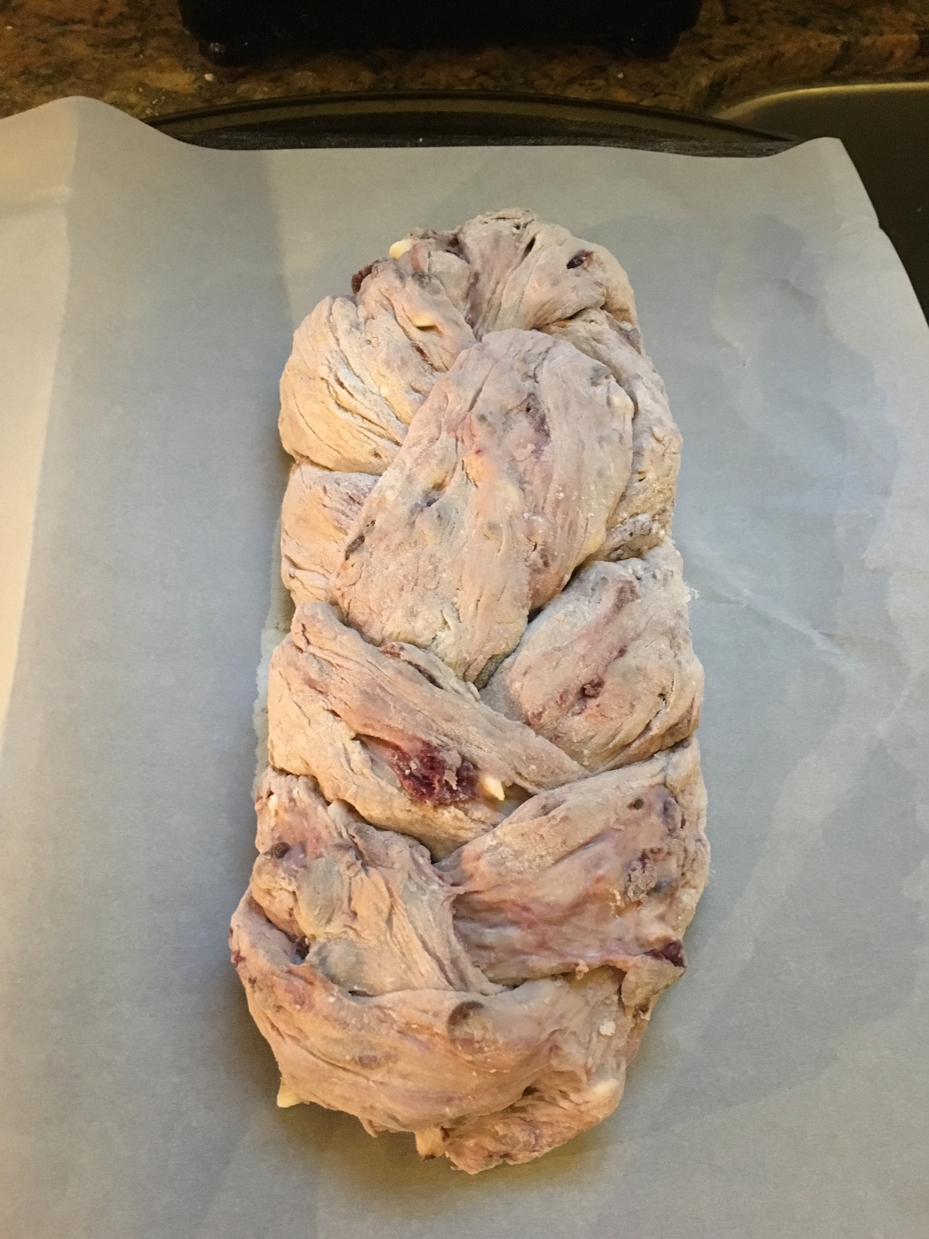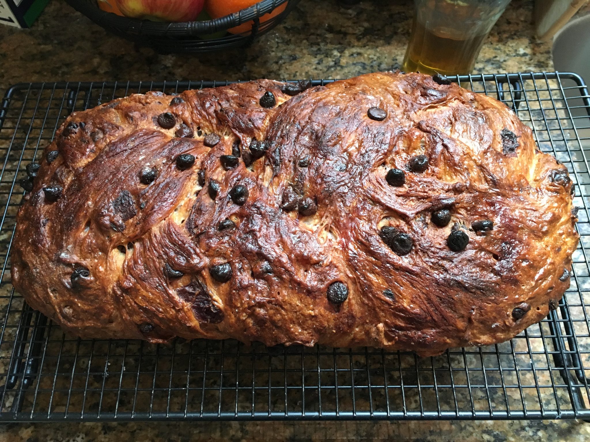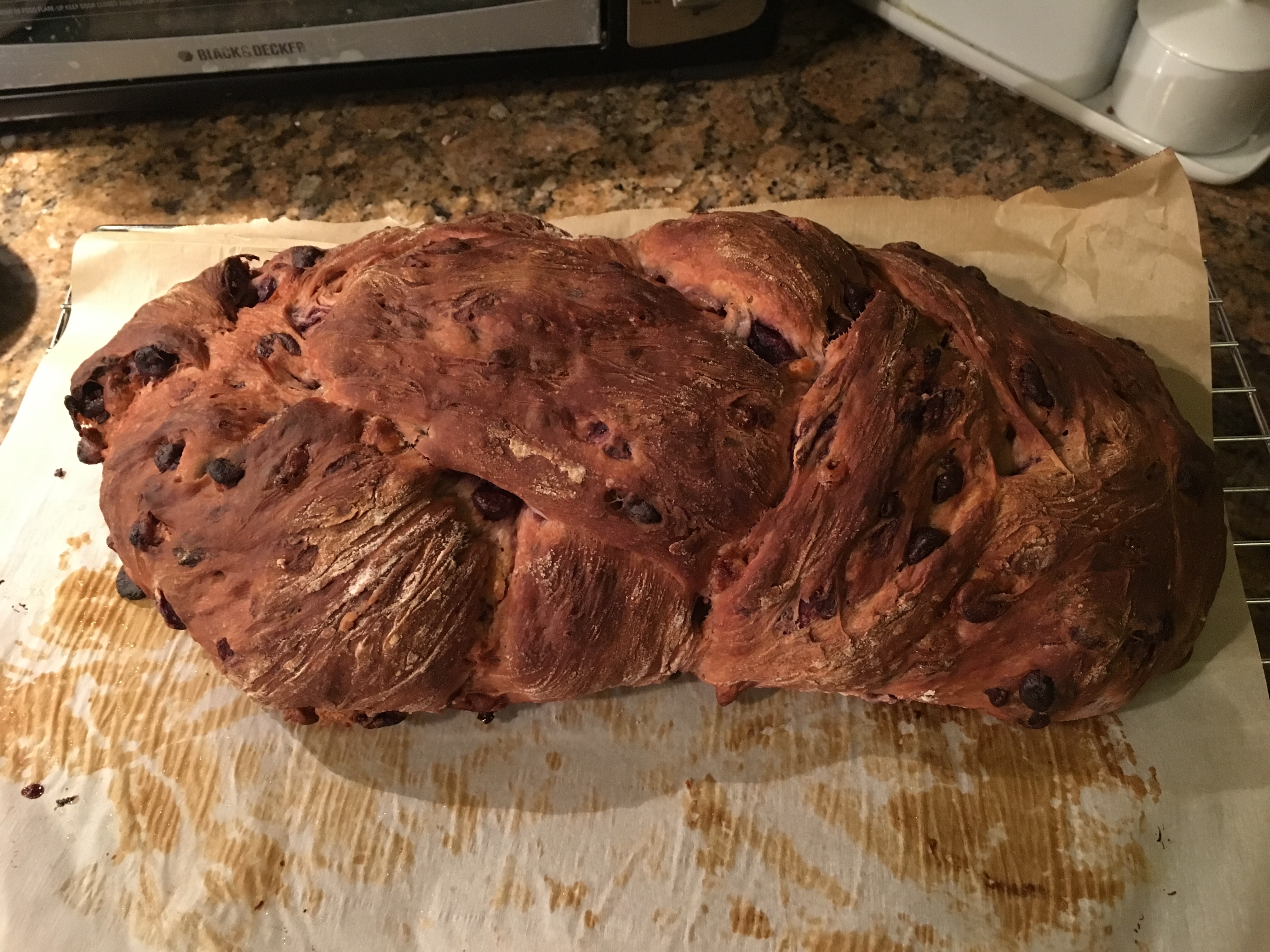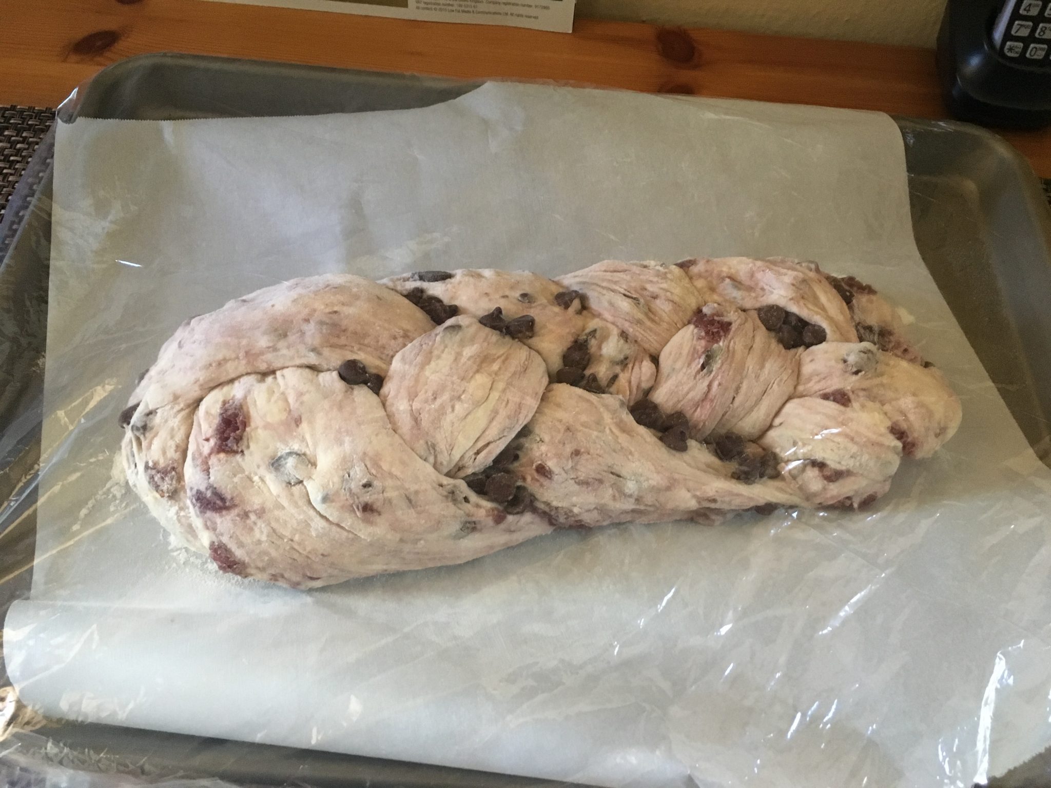 A good thing I learned metric; after we watched the Great British Bake Off Masterclass episode (season 1, part 4)  the other night, they got me at the “Cherry Chocolate bread“. As it merges two of my two favorites flavors, I looked up the Paul Hollywood recipe to see if I could recreate it. After 2 proofs, one braid and a bake.. it’s was done! Now all we have to do is taste.