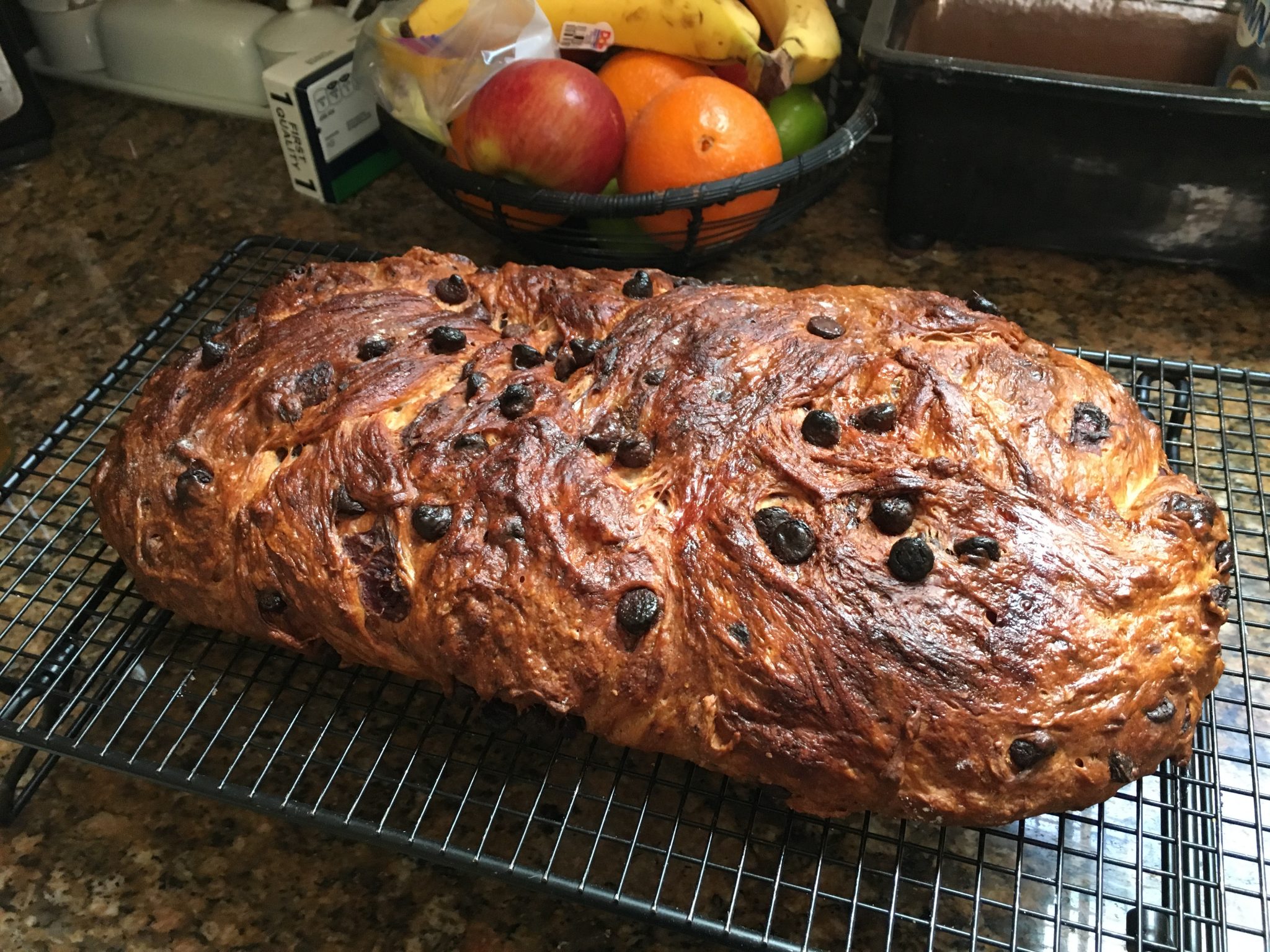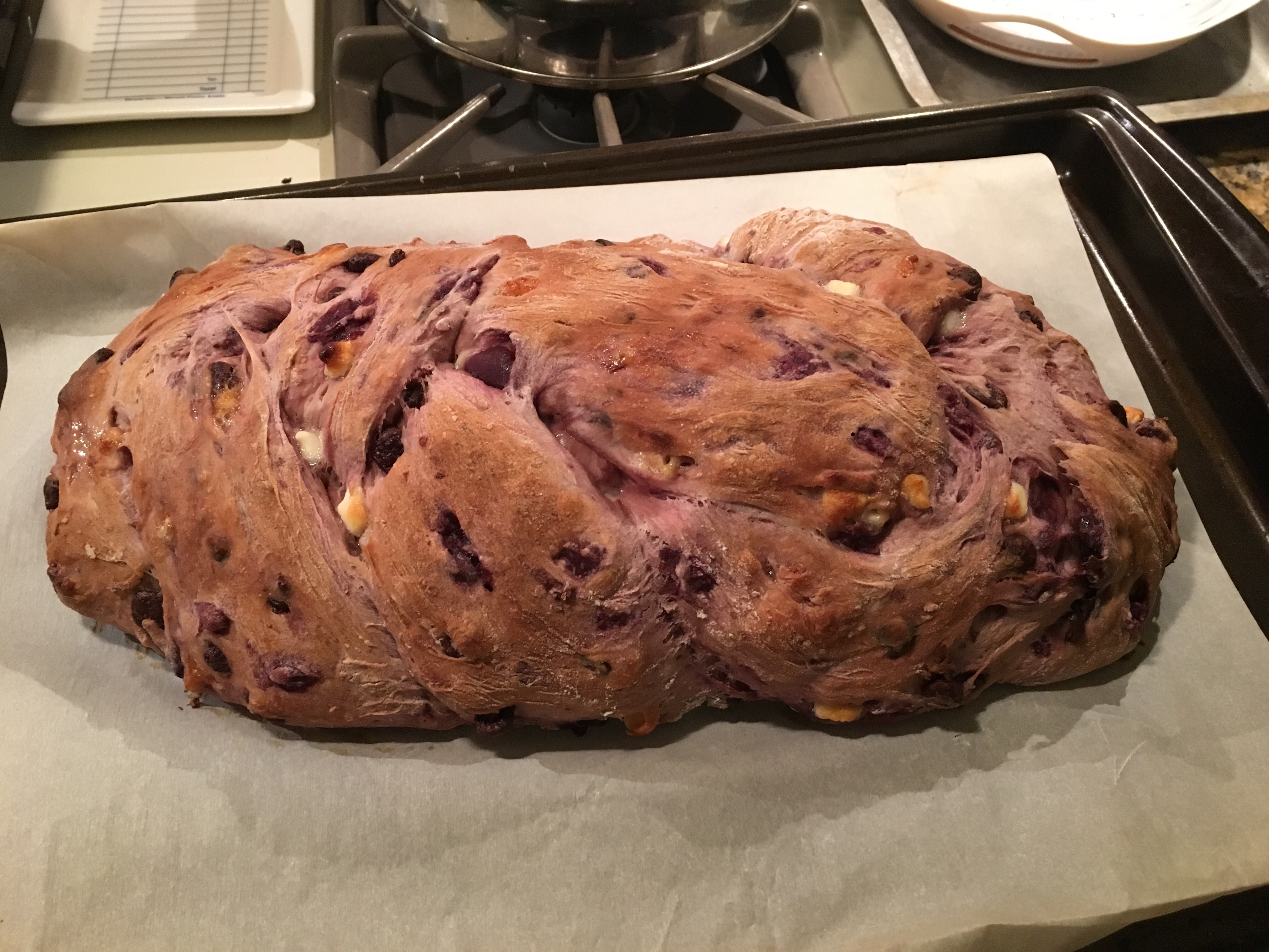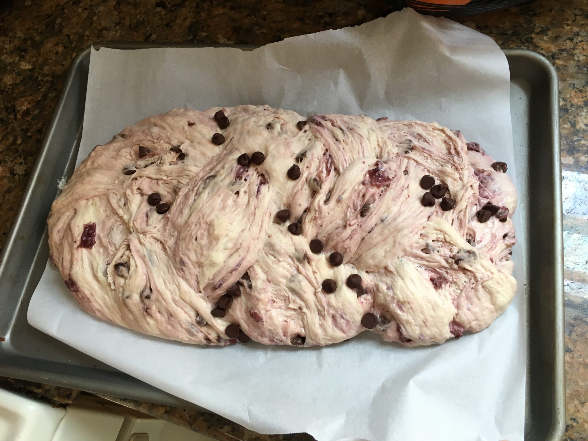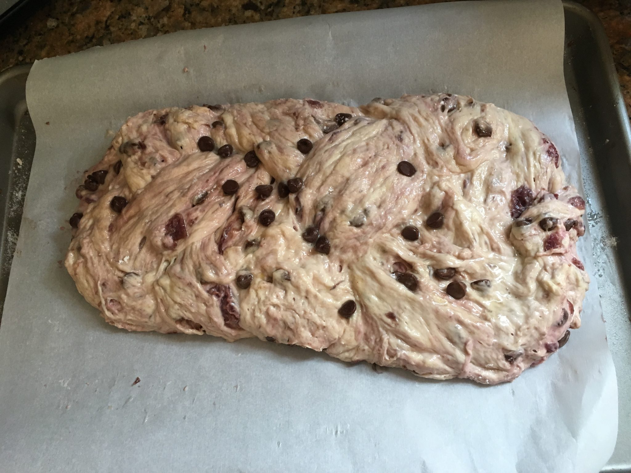 So back on May 5th. I tried my hand at some new  breads – and here I am at it again  – the first one used the same ingredients; cherries, white & chocolate chips & almonds but different ratios and types of flour and was baked in the Dutch Oven instead of braided and has both an overnight proof and a second 2 hour one before baking. Note: this is a much older recipe and didnt account for post 1990 stoves so I could have taken it out sooner.