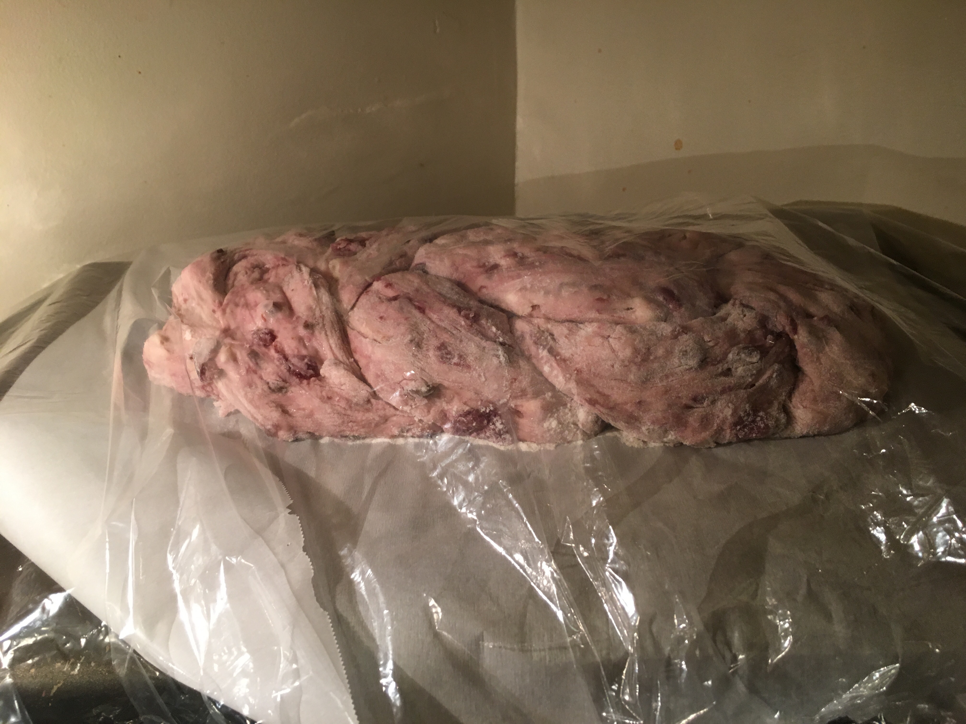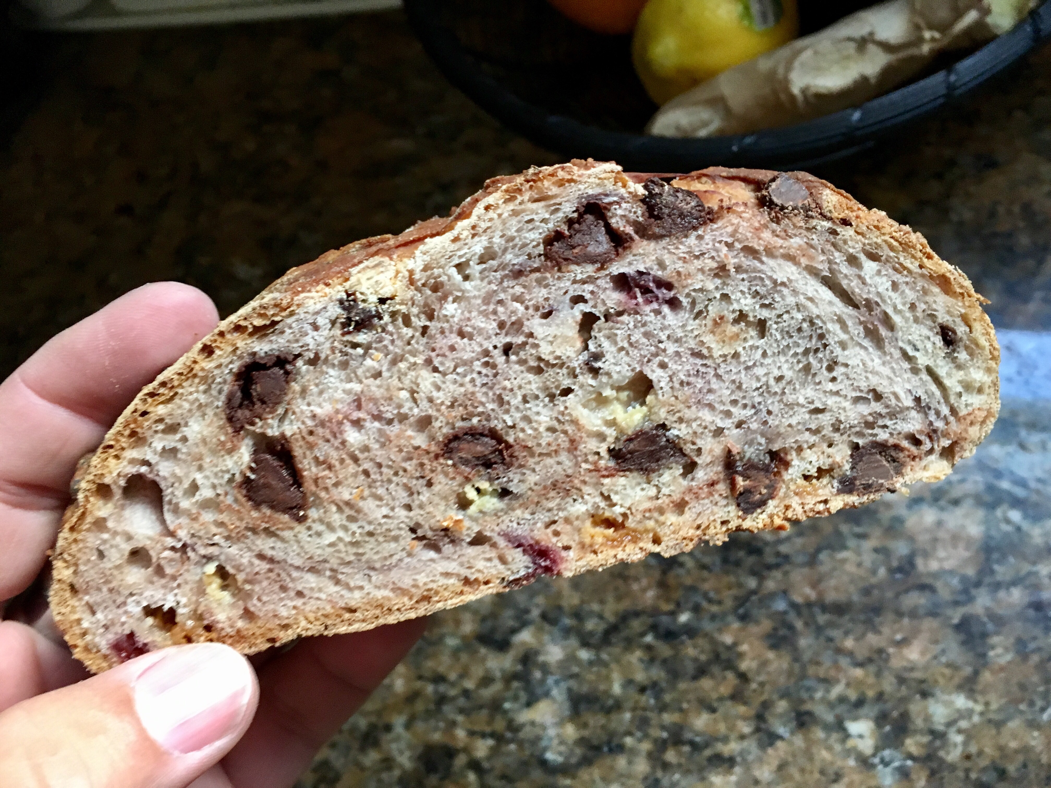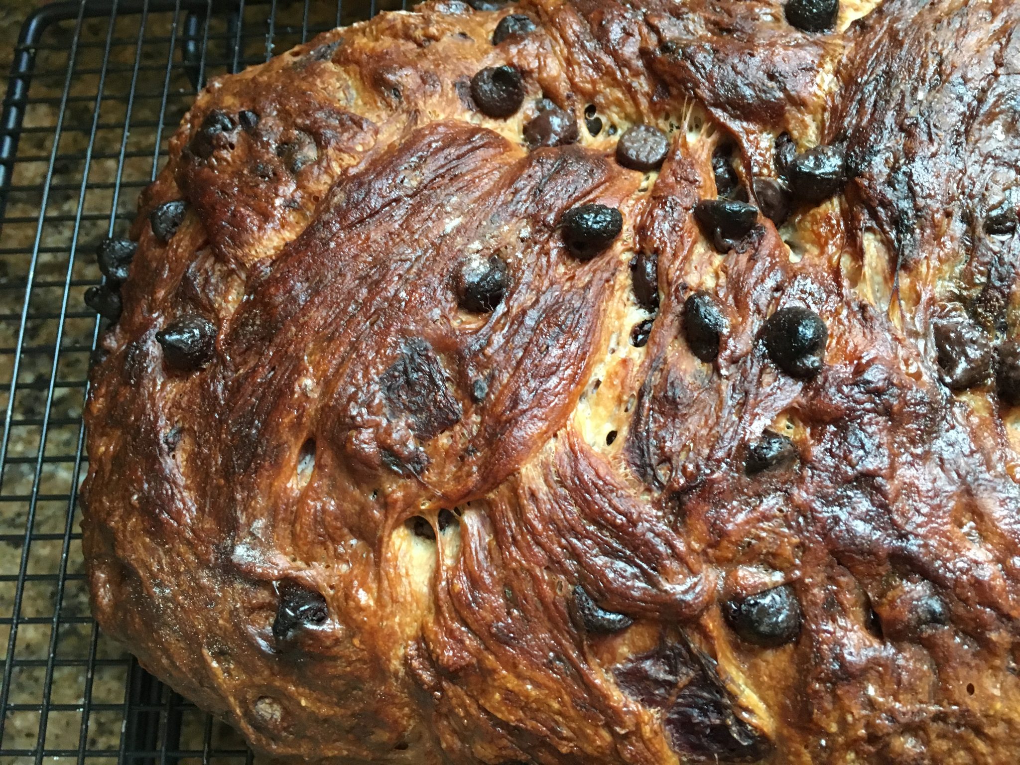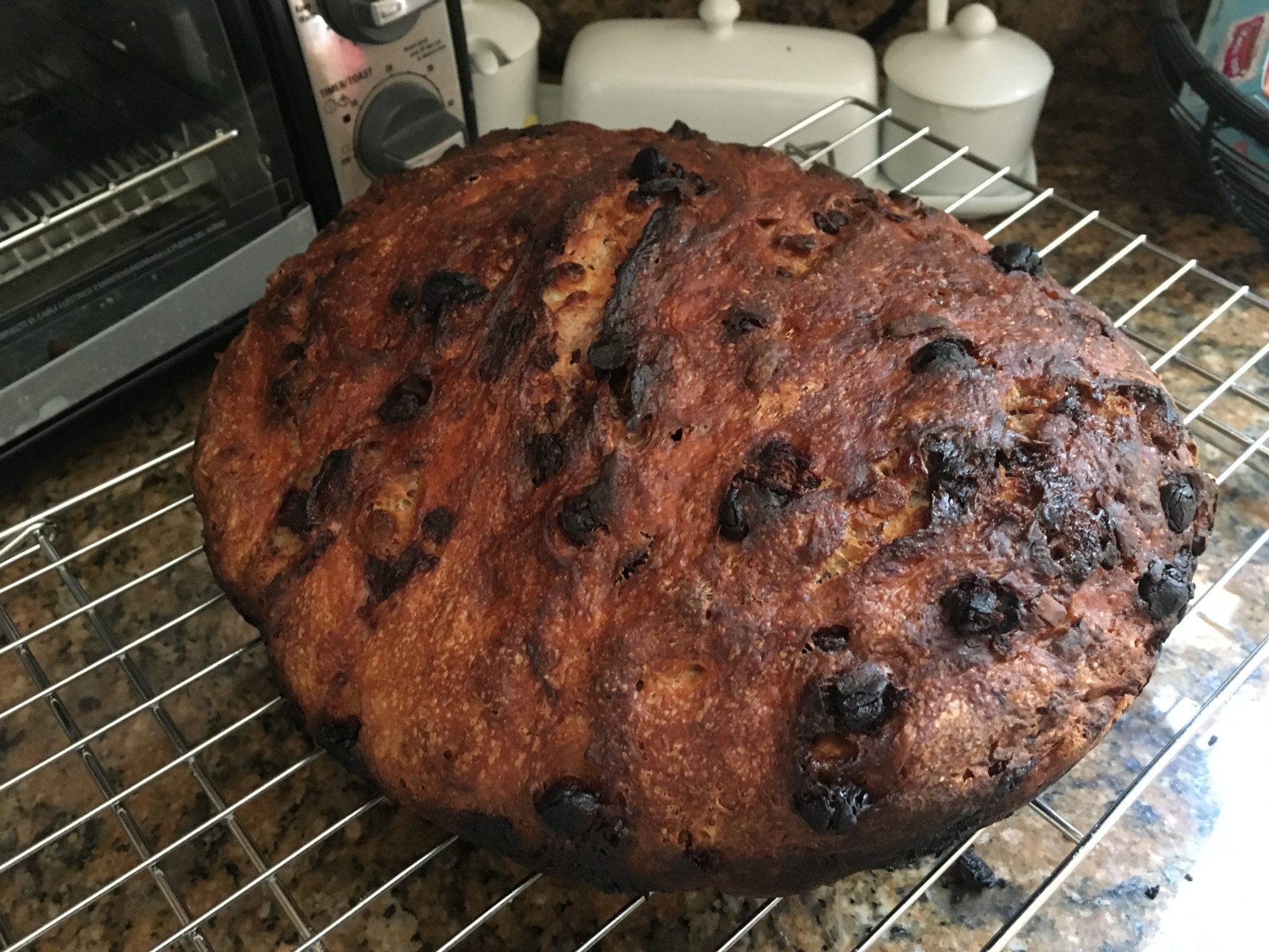 So back on May 5th. I tried my hand at some new  breads – and here I am at it again  – the first one used the same ingredients; cherries, white & chocolate chips & almonds but different ratios and types of flour and was baked in the Dutch Oven instead of braided and has both an overnight proof and a second 2 hour one before baking. Note: this is a much older recipe and didnt account for post 1990 stoves so I could have taken it out sooner.