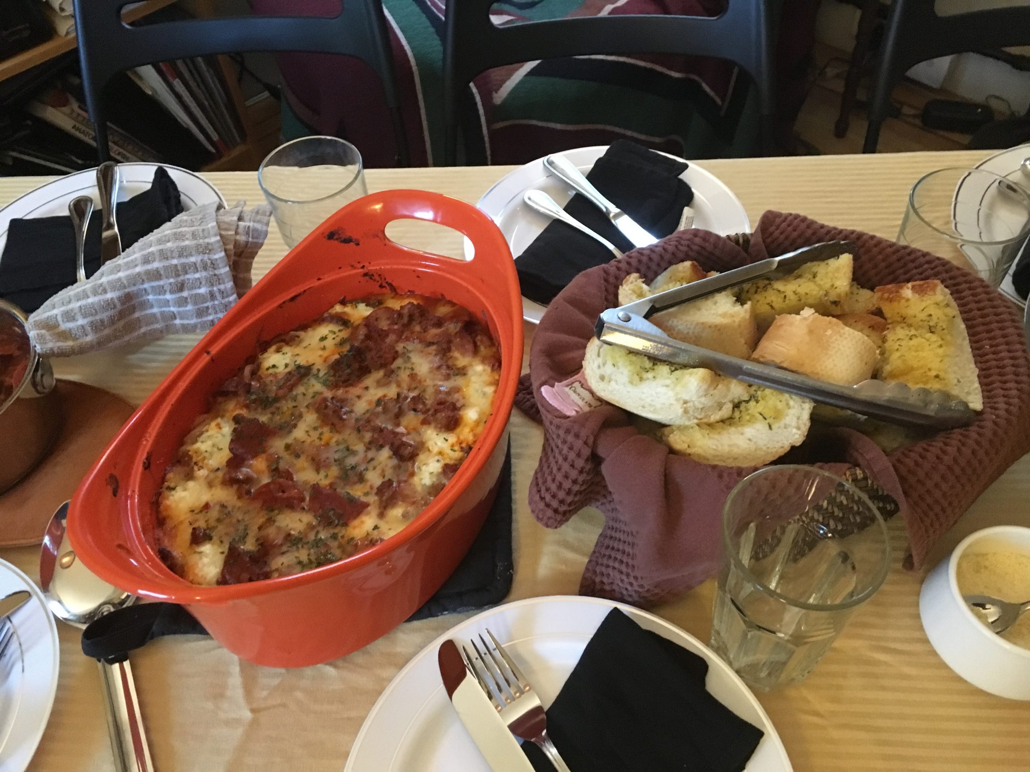 Often for the weekend SEN events, I tended to do all the cooking (except for the junk food table which often held every sweet treat, salty, sugary snack that we ould pre-buy that would sit on a table for the whole weekend for those late-night munchies) while Josh would serve as the front man-cruise director for the social stuff. On those trips when an oven was available – our first night menu was frozen lasagna dinners with a green salad and garlic bread. As it was easiest meal to get prepared on the day of travel as people rolled in.