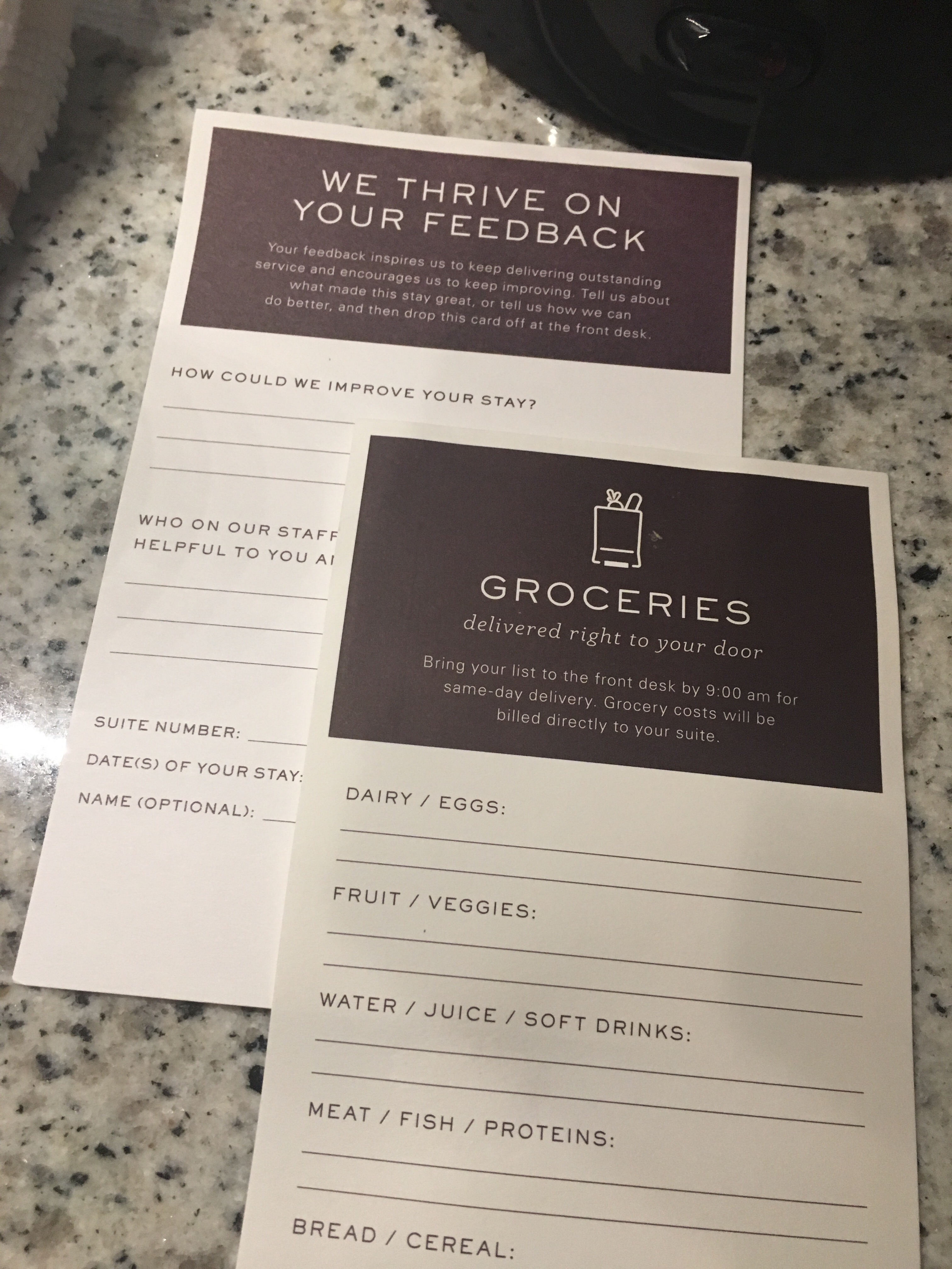 Word up though; while not the most expensive of the hotels in this area it isn’t inexpensive. So plan ahead, sign up with Marriott deals so that you can utilize your points or discounts as appropriate. This site also is within a short walk to the childrens museum; so on this visit also staying were more families than previous stays which made navigating the breakfast buffett a little “treacherous” as not all children (and some adults it would seem) have been taught proper public shared food space/buffett curtesies or hygiene practices. So if you want particularly kid or family-friendly you might want to call ahead to find out if there’s a kid focused weekend happening. Another fav feature is the “grocery option”. Many of the facilities will now do some basic grocery runs to stock up the very workable kitchens. Billing your rooms and saving you time.