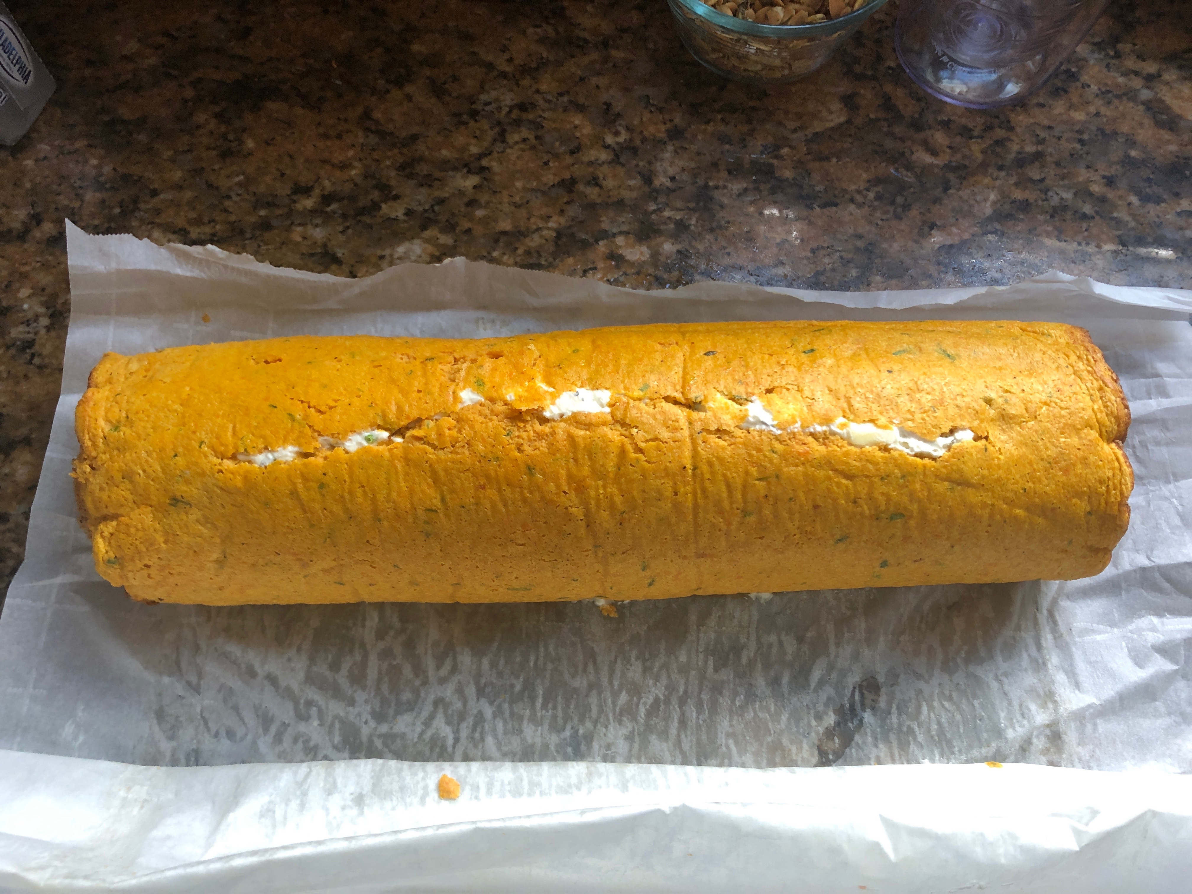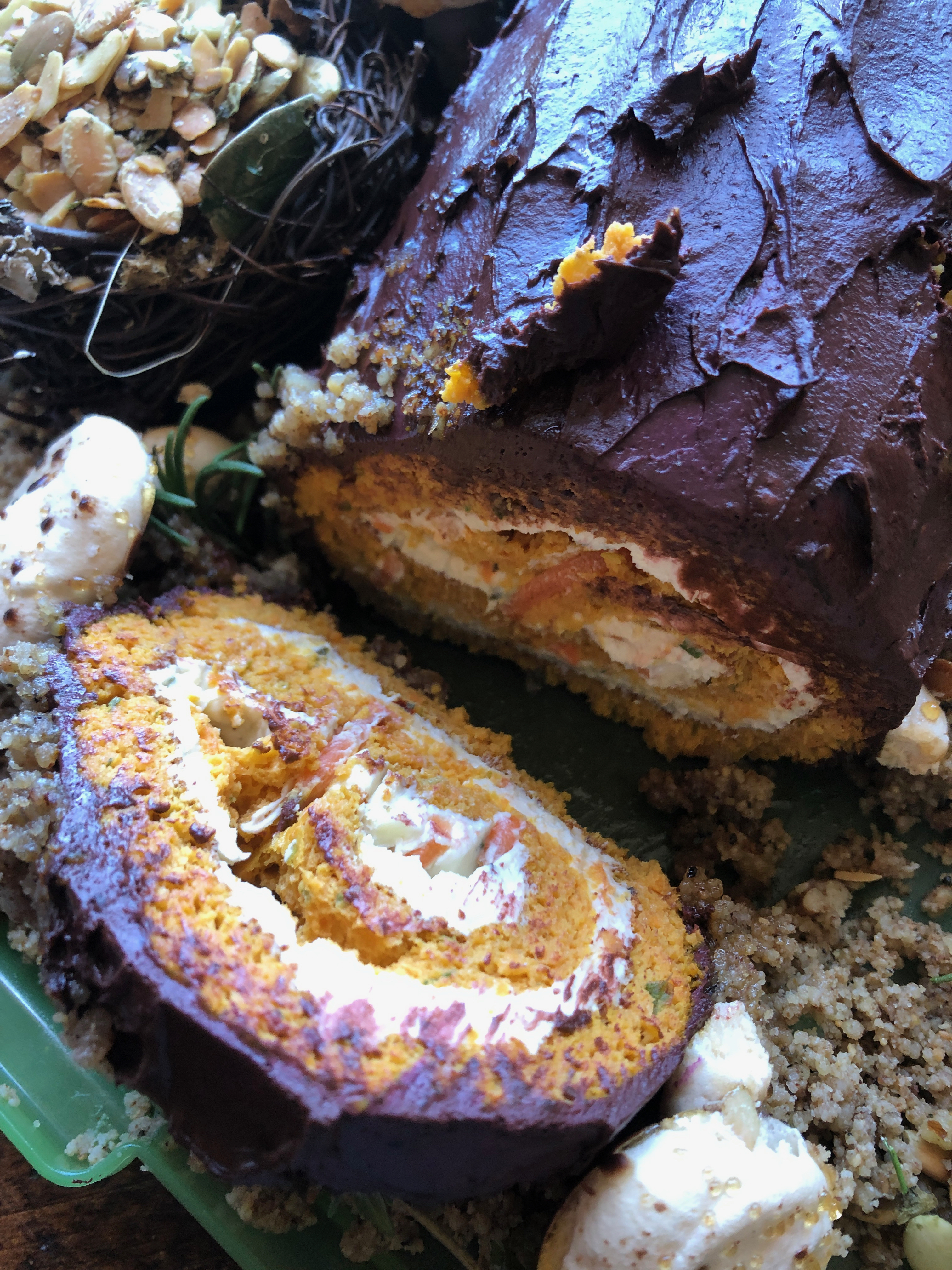I found a recipe online for a flourless, sweet potato and chive log with savory cream cheese, tomato and herb filling covered in cream cheese and spicey eggplant pesto frosting. The formal recipe for this can be found here.