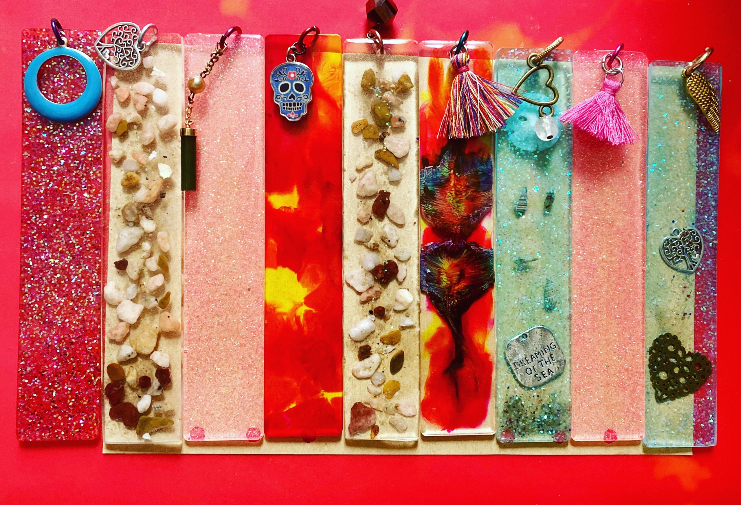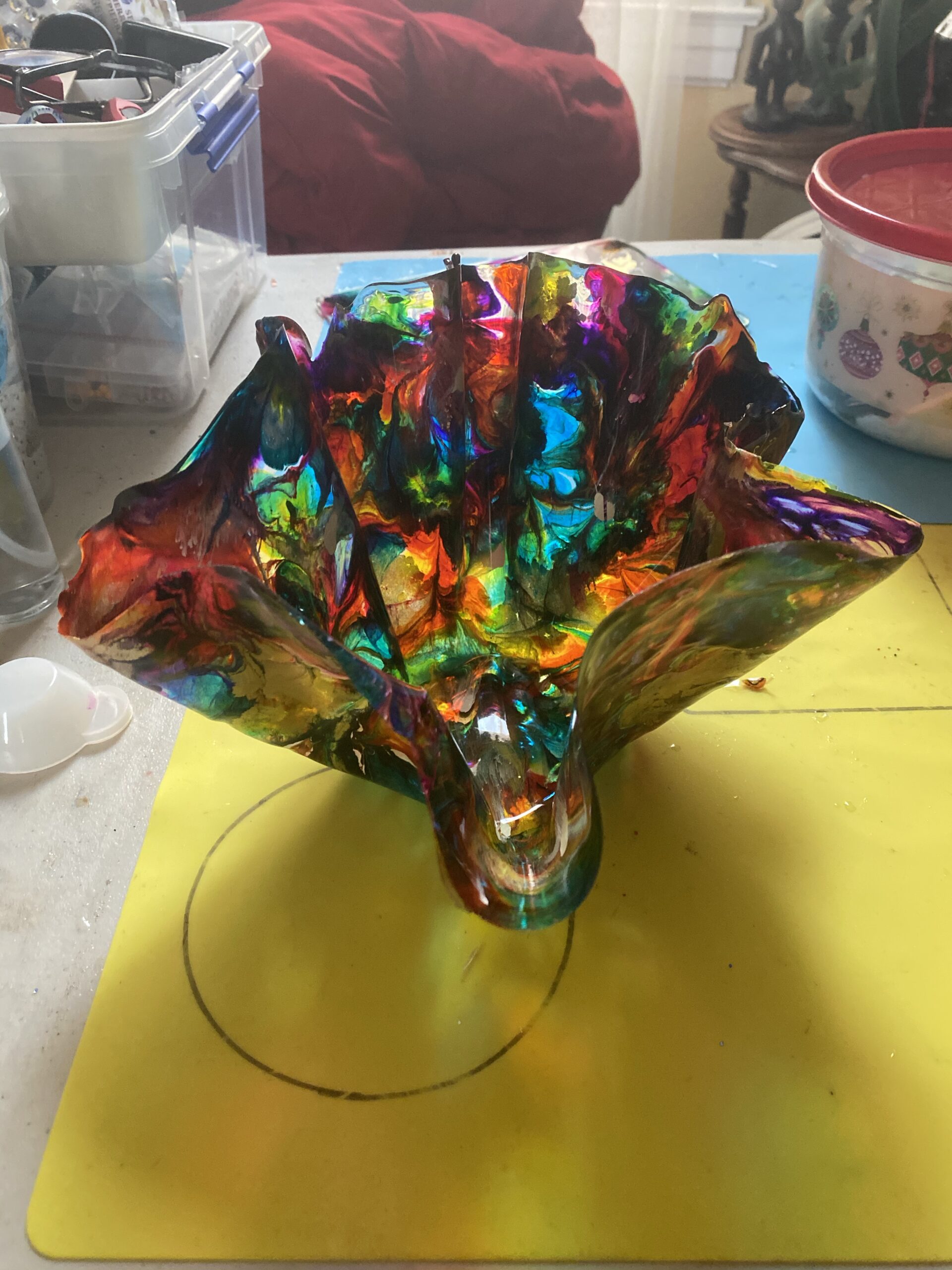 I decided to see how free form resin pours would come out with an eye towards making a vase/candy dish/trinket bowl type thingy. Definite lessons learned but for my first try, it’s not awful. The with the surplus resin I did a series of bookmarks