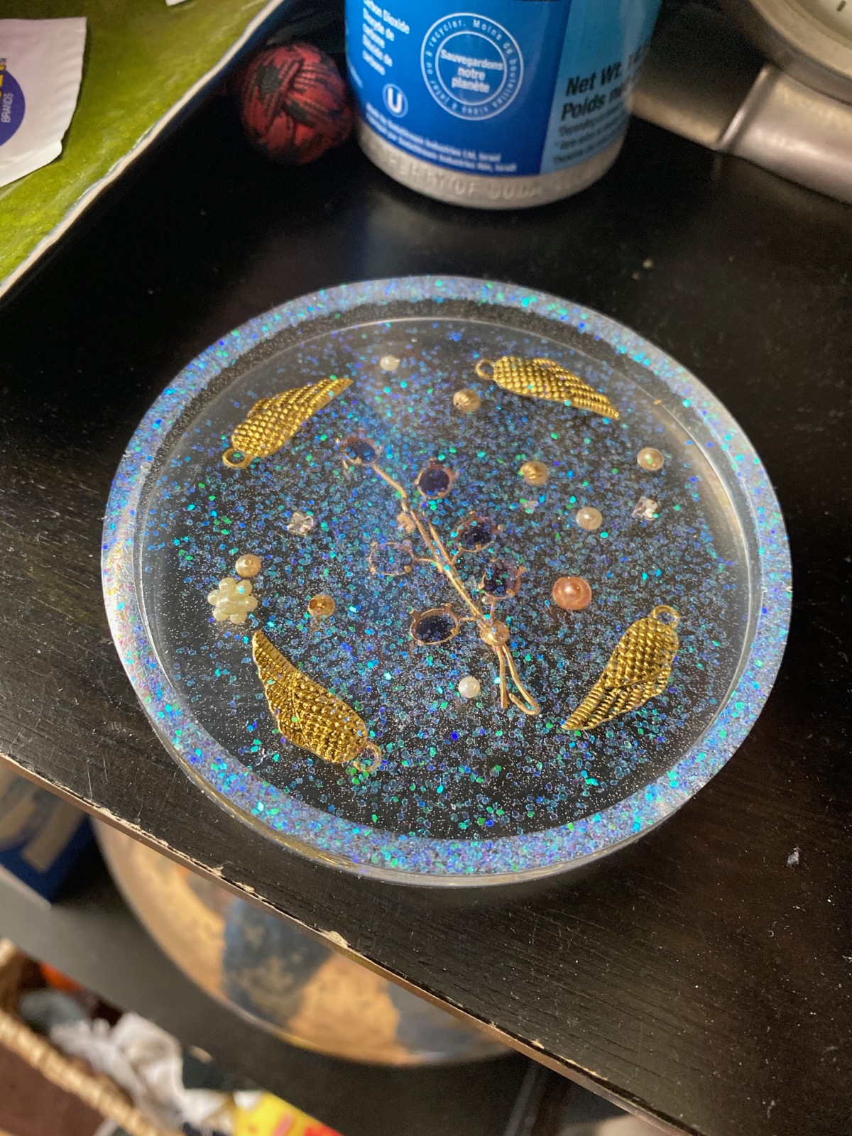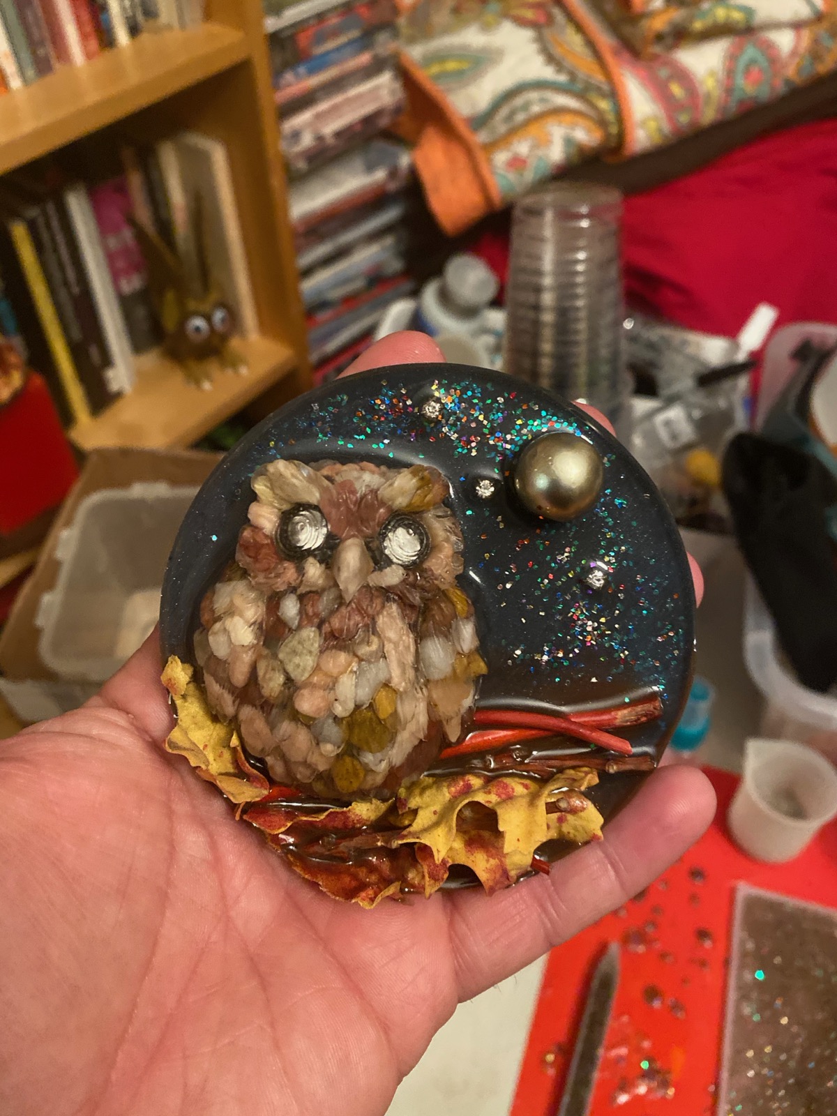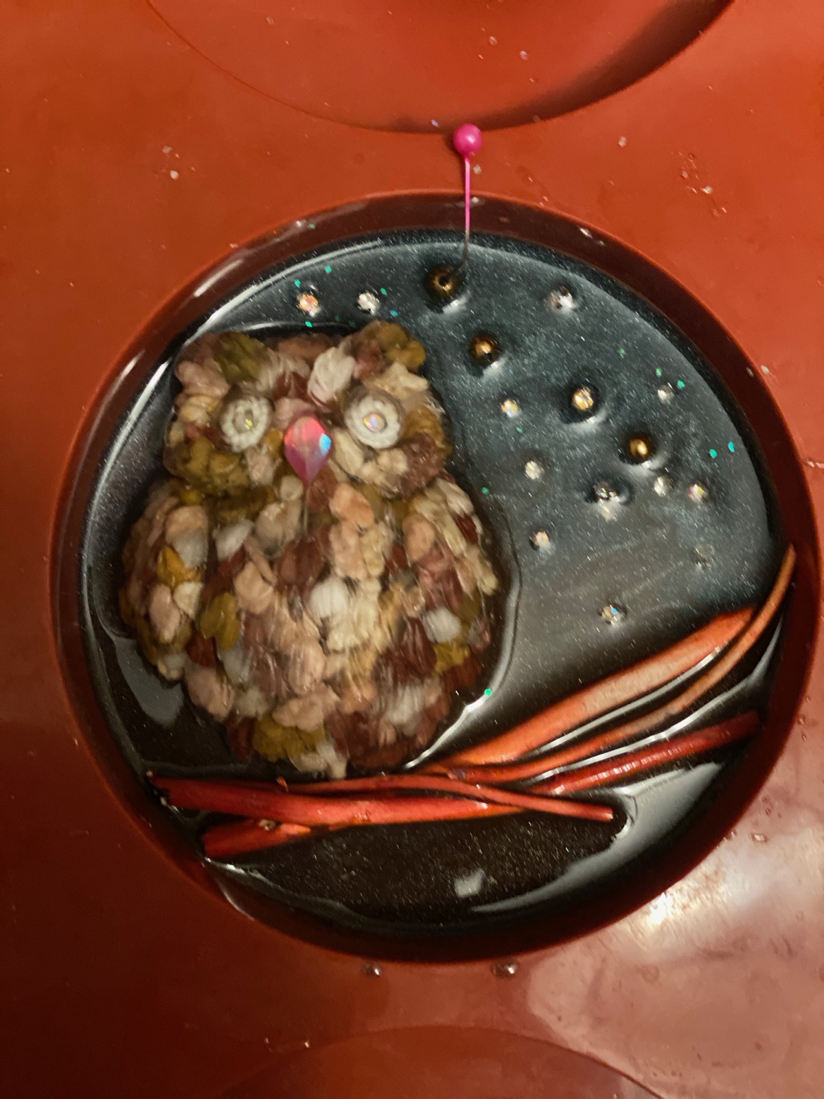 I first started with pouring and casting coasters to get a feel for the process (and yes they will most likely show up somewhere come December for gifts). It was an interesting process needing to pay attention to the temperature in the room and bubbles etc. from Coasters I branched out to more art-themed pieces with some multidimensional art with some practice pieces using an owl mold filled with pebbles for feathers.