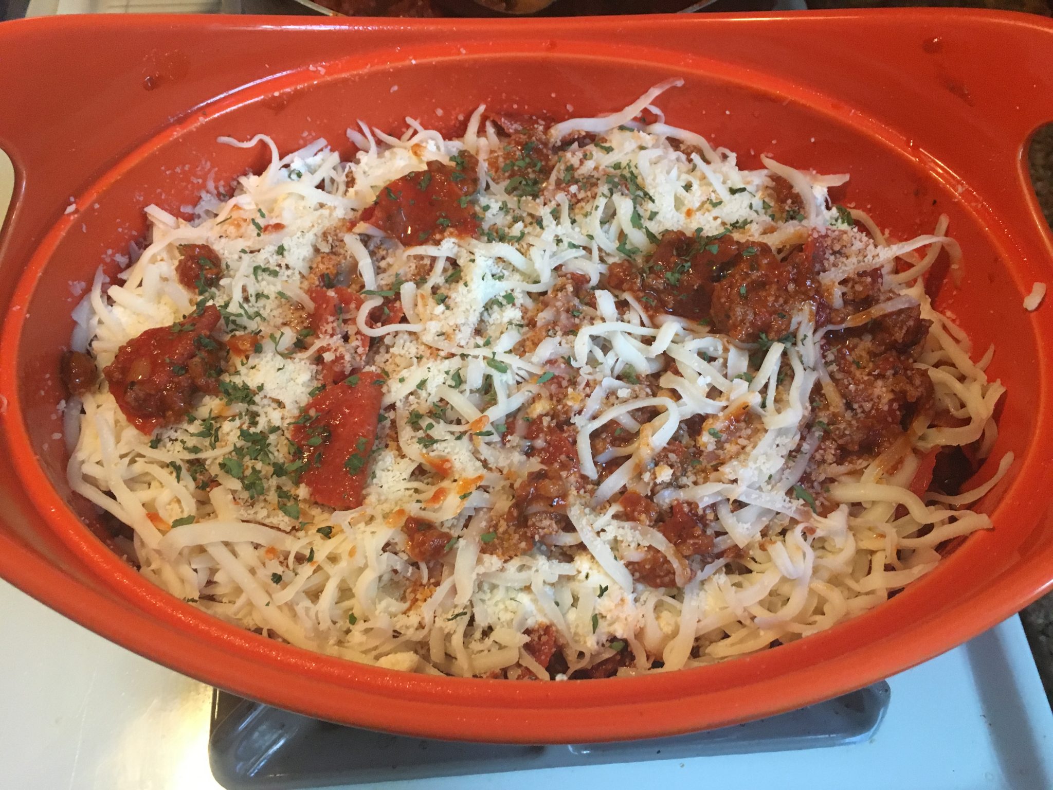 So let me say first of.. Don’t screw it the recipe. It is great as is. So good in fact that had I added beans to the sauce mixture, topped it with cheese I would eat it as is and forget the noodles!