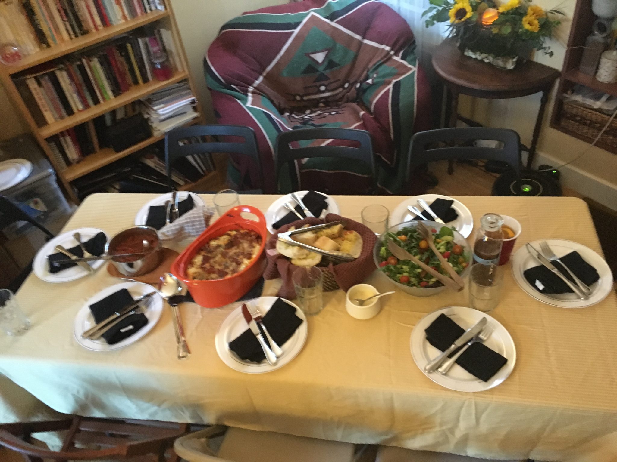Often for the weekend SEN events, I tended to do all the cooking (except for the junk food table which often held every sweet treat, salty, sugary snack that we ould pre-buy that would sit on a table for the whole weekend for those late-night munchies) while Josh would serve as the front man-cruise director for the social stuff. On those trips when an oven was available – our first night menu was frozen lasagna dinners with a green salad and garlic bread. As it was easiest meal to get prepared on the day of travel as people rolled in.