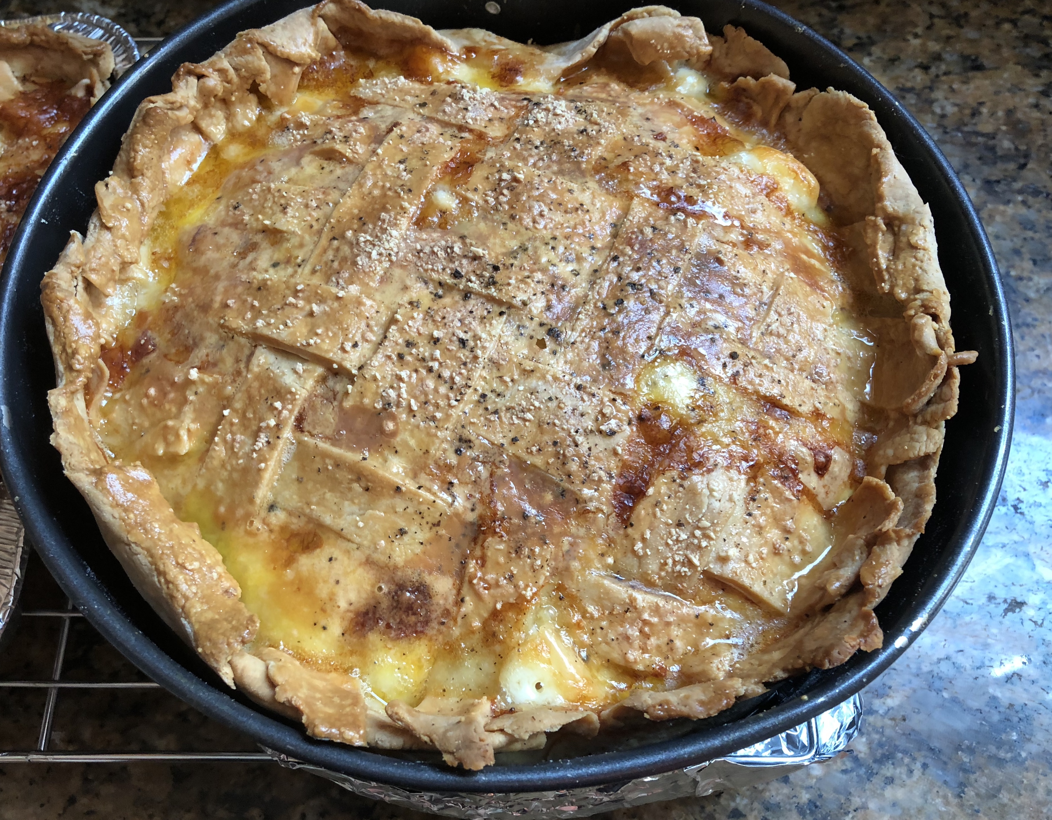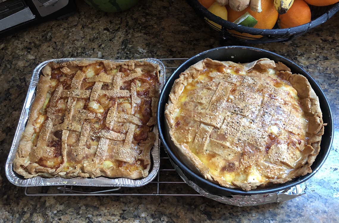 “The House of Dino has done it again. Chef Frank and sous-chef de cuisine, Shadow, have brought an Italian tradition into the 21st century. Their Easter Ham Pie is moist, salty, and creamy. All your favorite breakfast foods… eggs, bacon, ham…rolled up into one beautiful pie. Served warm or cold, it simply melts in your mouth. The crispy flaky crust holds the magic together. Just like your Italian grandmother made…only better.  Well done, boys!