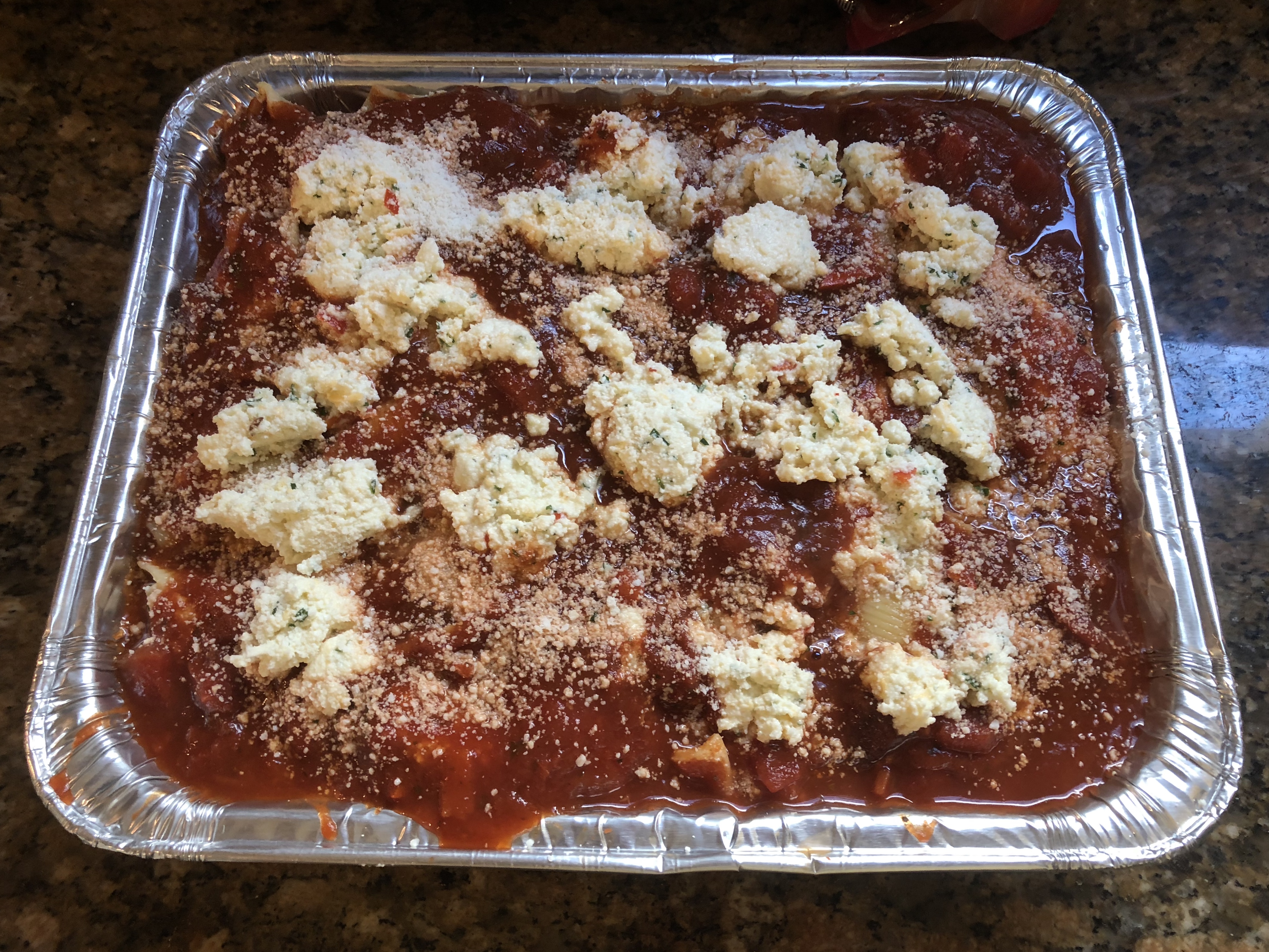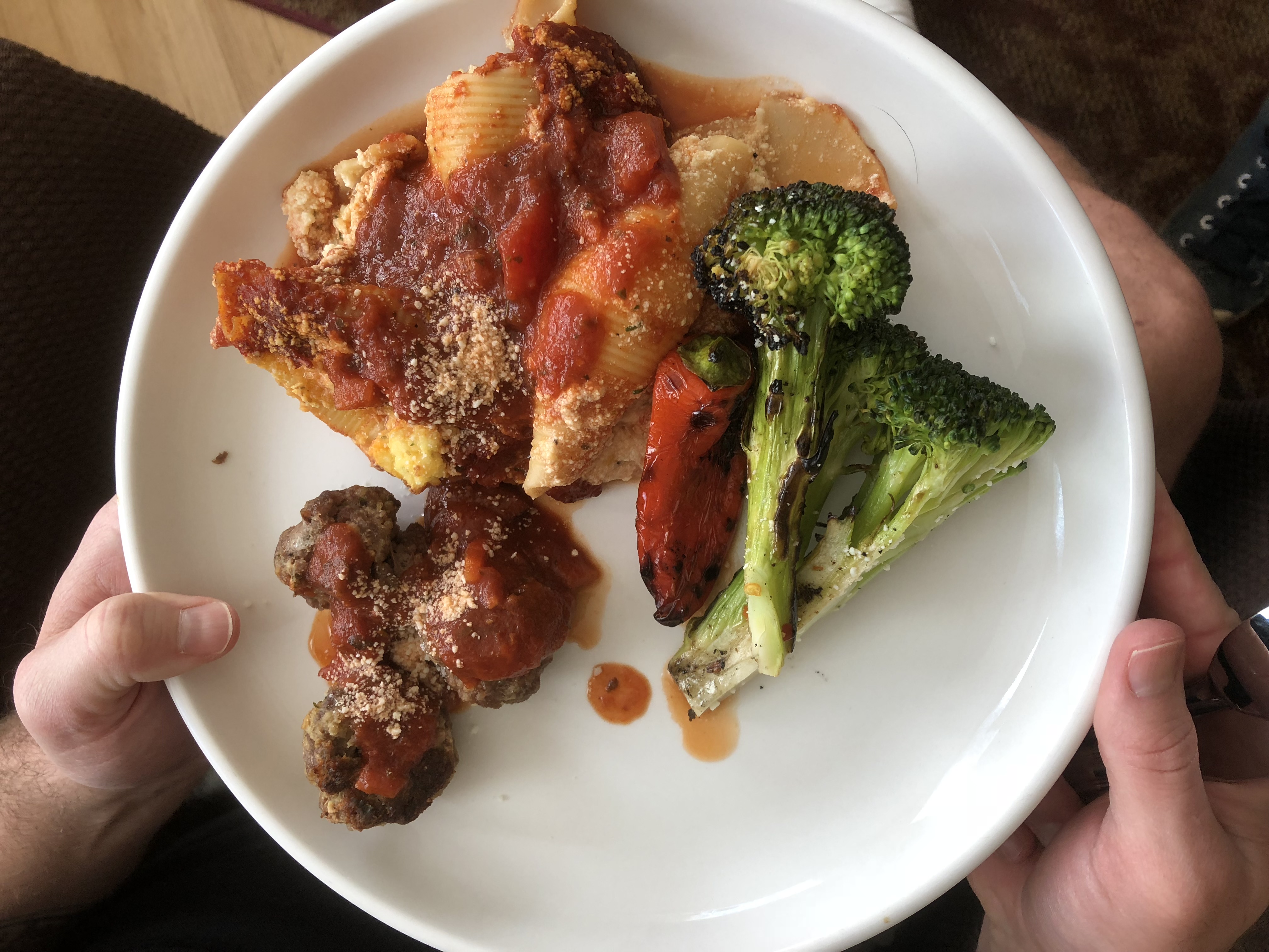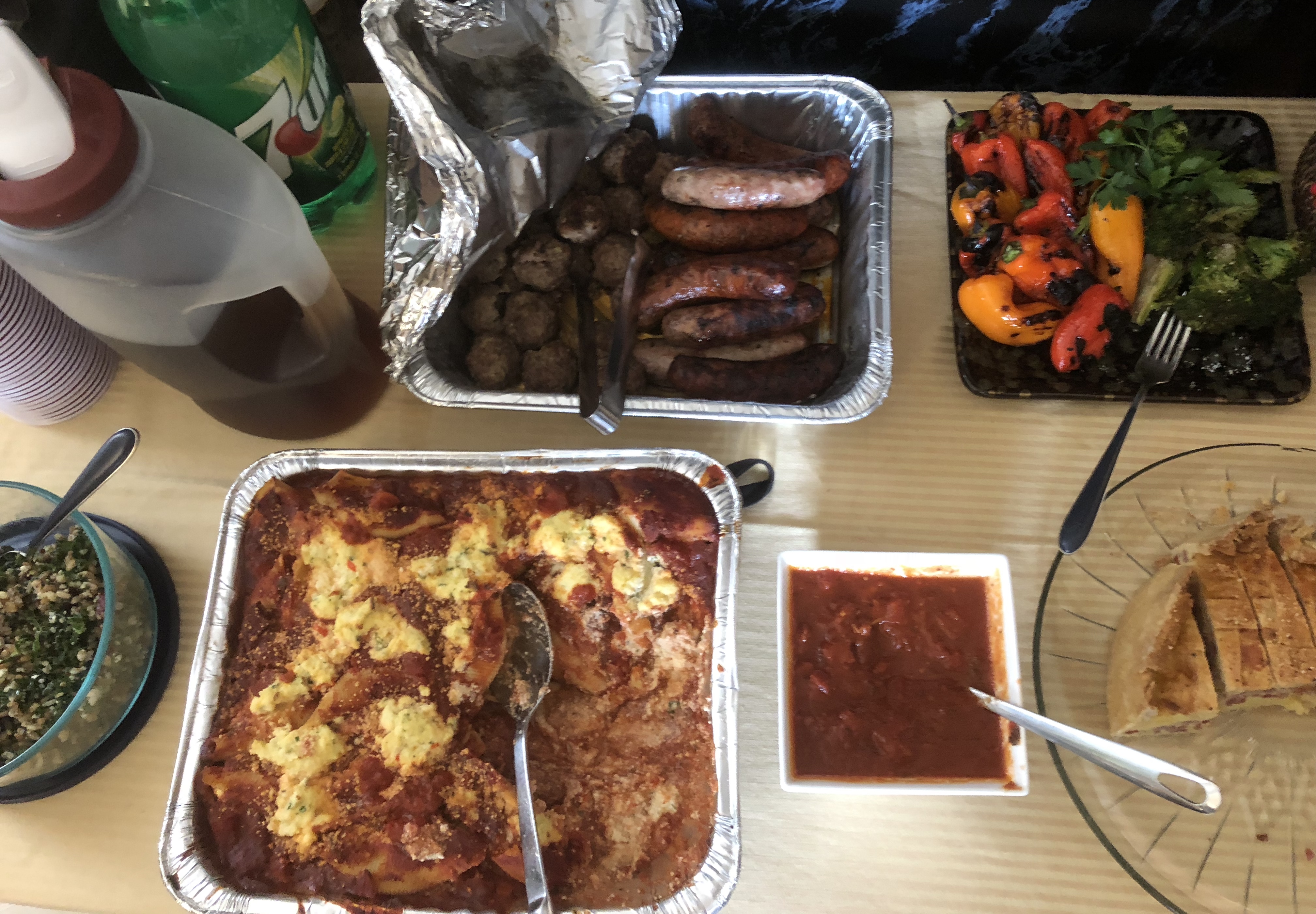 Later today we planned a very last minute meal with just a few pals doing a potluck. But since we had a ham a few weeks ago, I decided to go super simple with some baked ricotta & herb shells, meatballs, grilled sausages, and peppers.