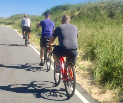 So we made the short walk up to the road to PTownBikes   (Address: 42 Bradford St, Provincetown, MA 02657, Phone: (508) 487-8735). After getting our annual “rules of the road” reminders, we were off for a short ride to Herring Cove  to show the boys around that end of the town.