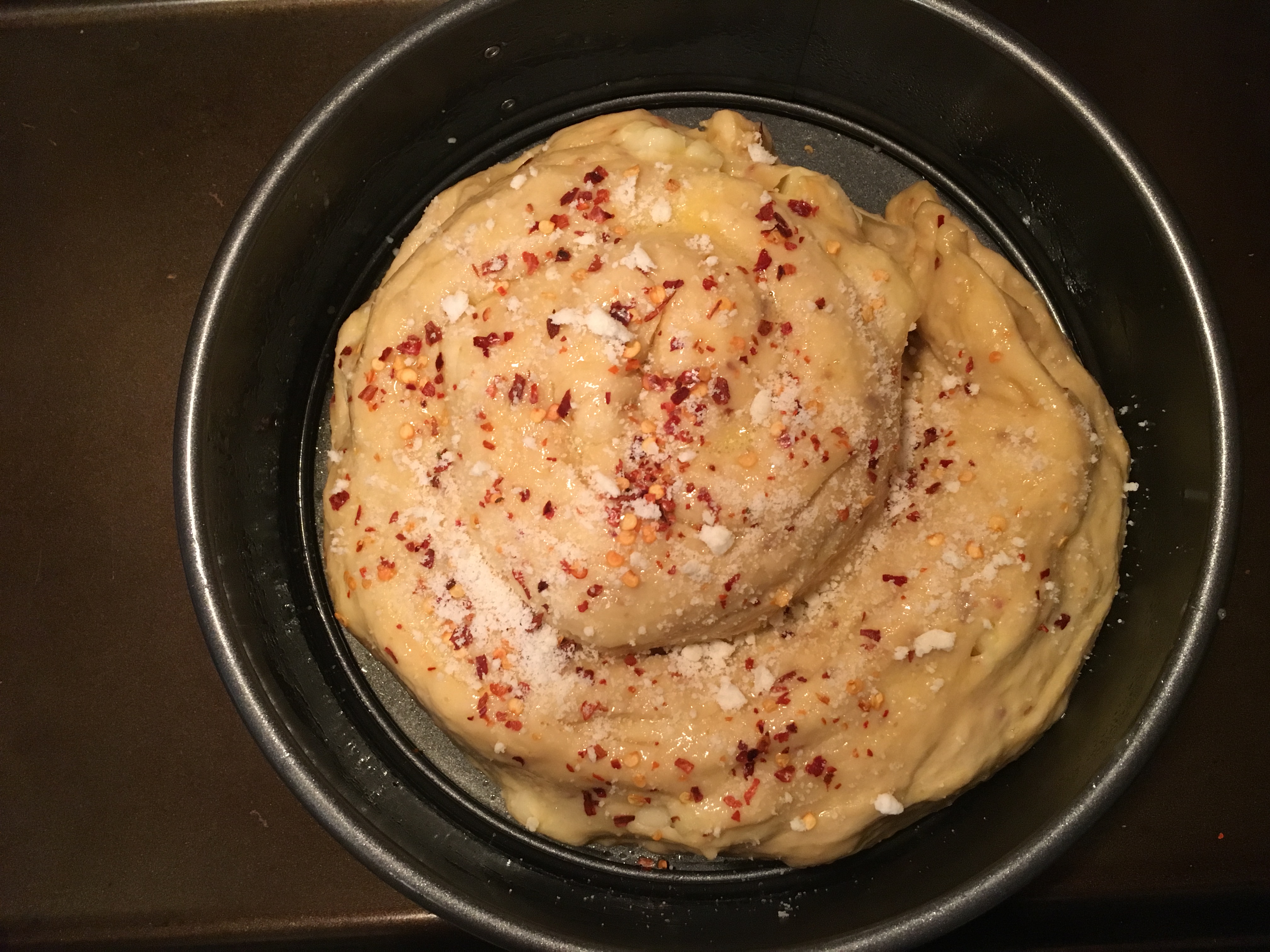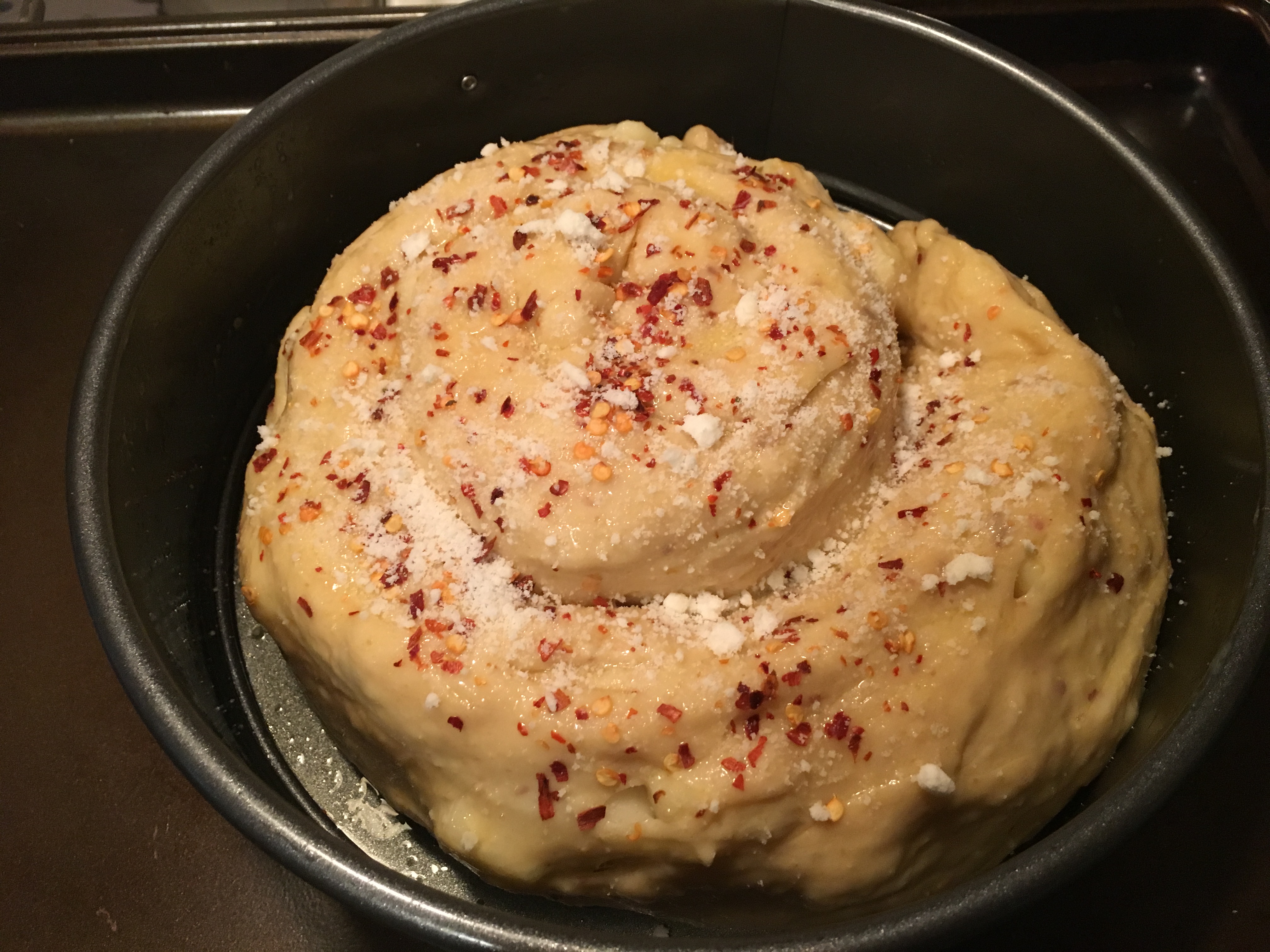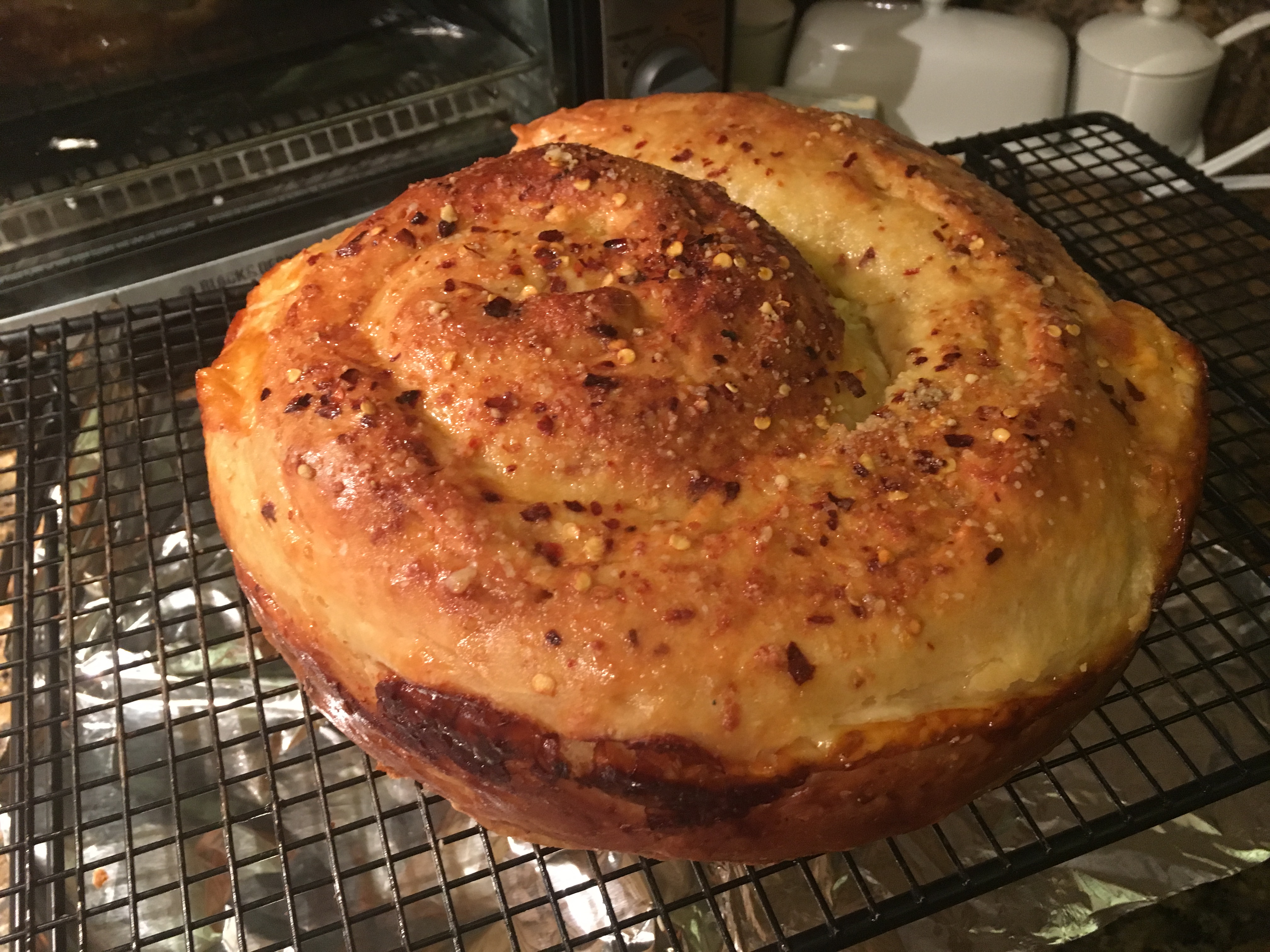 The recipe wasn’t as hard as I anticipated. Don’t get too nervous about the amount of red pepper either – you really need it to balance with cheeses. Note: this bread reheats really well and I can tell on its own or alongside a hearty stew it’s a keeper. My next plan is to play with the recipe and add cooked off diced prosciutto or sausage!