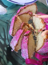 As a backup, because every Princess needs a “plan B” I also made a Hot Milk Cake which was from my Mom’s Cookbook, as I had never made this recipe before I wasn’t sure of how it would taste initially. But after some sneaking and testing of the bottom – I found I liked the flavor as well, and while my initial concern was it was underdone – in the end – it had a good texture and could have come out a bit earlier. Since it was already made, it got gussied up this morning to take to our pals “10 year anniversary of meeting” brunch. It also being Castro Street Fair – I figured some pink sugar glitter over a simple milk & sugar glaze with lemon zest would do the job.